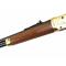 La crosse et la longuesse en noyer américain en poncé huilé sont dans un état proche du neuf. La crosse sur son flanc droit possède une médaille en laiton incrustée représentant en premier plan le visage d'un chef Sioux SITTING BULL et en arrière plan des représntant des peintures tribales indiennes. Le tout est orné de 8 clous. Plaque de couche acier d'origine.