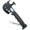 29.21cm overall. 12.70cm black oxide coated 420 stainless axe head with 10.16cm cutting edge. Black ABS handle. Belt/cord cutter. Glass breaker. Lanyard hole. Hex sockets (9/16, 1/2, 3/8, 7/16, 15mm, 13mm, 10mm, 11mm), backed hex socket, wire twist, recessed nail puller, pry bar, box cutter, can opener, demolition grip teeth, hammer head, hammer claw, spanner wrench for hose couplings, gas valve shut-off wrench, bottle opener, screws for access to replace seat belt and sawzall blades, belt cutter with replaceable blade, locking and replaceable 15.24cm blade. Black nylon sheath. Clam packed.