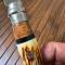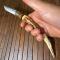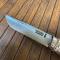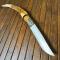 Manche pleine corne bois de Cerf sculpté en bout d'une tête d'aigle bec ouvert, et insert de loupe d'orme , cran de sûreté rotatif, lame 8,3 cm .