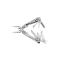 Le manche en acier, de finition grise, assure une prise en main confortable et durable. Un clip de port pratique permet de fixer l'outil à une ceinture ou un sac, facilitant son transport. La couleur blanche de la lame et le profil de pince ajoutent une touche esthétique à cet outil multifonction.