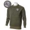 Pull maille jersey, 30 % laine, jauge 7, jauge intérieure et extérieure. Col rond et bord côte aux manches et à la taille contrastés, empiècements suédine aux épaules. Produit lavé et assoupli pour un toucher doux. Coloris kaki. Fabrication française.