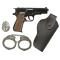 Pistolet en métal moulé, plaquettes plastiques, munitions à amorces, barillet 8 coups. Longueur 195 mm. Poids 360 g. Ce pack comprend, un pistolet POLICE, une médaille Police, une paire de menottes, et un étui de ceinture. Livré sans amorce.