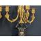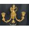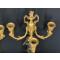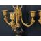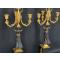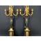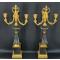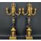 Paire de candélabres d'époque Empire en bronze à patine noire et dorée, à décor de cariatides drapées supportant des urnes à trois bras de lumière ornés de têtes de lions. Les bases à décor de palmettes et Victoires ailées. Hauteur : 57 cm