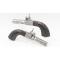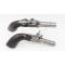 Belle paire de pistolets de poche dit de voyage, un coup à percussion, numérotés 14 et 15. Finition poli blanc dans une belle patine, gravures de fleurs sur les coffres, canons tournés formant des godrons, longs de 47mm à forte rayures, calibre 10mm. Mécanismes complet et fonctionnel. Crosses type renaissance en ébène, calottes à facettes. Longueurs totales 15,5cm.