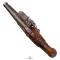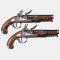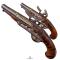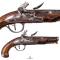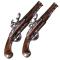 Paire de pistolets d'officier à silex signés "Le Roy à Joinville". Canons ronds 14 cm, décorations dorées et finition bleuie. Crosse en noyer, garnitures acier, baguettes ébène avec pommeau en os. Excellent état; légère fissure sur un chien.