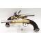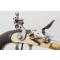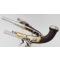 Paire de pistolet à silex à coffre en laiton système brevet d'invention Moulard Dufour à Saint-Étienne. Mécanismes complet et fonctionnel contenus dans de gros coffre de laiton, chiens à col de cygne, canons à pans en fer maintenus par les baguettes d'entretien, long de 16,3cm à bouches tromblonnées, calibre 15,5mm à rayures cheveux, poinçonnés de Augustin Merley et du canonnier Leclerc. Hausses de visée et guidon laiton. Pontets, batteries et leurs ressorts, calottes et brides de crosse supérieur en fer sans oxydation. Crosses quadrillées en noyer blond, avec légère usures sans accident. L. totale 30cm
