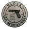 Elle est réalisée en aluminium et supporte une surimpression en relief d'un Glock 17, auréolé de la mention "Glock, Safe Action Pistols".