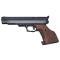 Pistolet air comprimé pour plombs à jupe, canon rayé 200 mm. Armement par la culasse, détente à bossette, poignée anatomique réglable, plaquette bois. Hausse micrométrique. Puissance 3,60 joules.