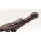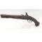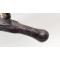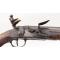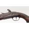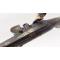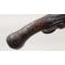 Pistolet à silex par Tezenas Jacques monté entièrement en fer, platine à corps plat décorée au trait et de fleurs, chien à col de cygne et bassinet sans bride typqie des années 1740 à 1746, pontet étroit décoré en suite et gravé de fleurettes, calotte à oreilles, contre-platine ajourée gravé de trophées d'armes, baguette en bois postérieur. Canon renforcé à méplat supérieurs et sur les côtés, long de 230mm, calibre 14.2mm. Monture en noyer moulurée sans accident ni manque, incrustation d'argent avec couronne de marquis, clou de calotte en argent ciselé d'un visage. Belle patine homogène de l'acier avec de l'oxydation uniquement autour de la lumière de mise à feu.