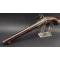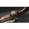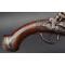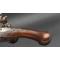 Pistolet à silex espagnol signé Antonio Doiztùa actif à Oviedo de 1780 à 1810, platine à la miquelet parfaitement fonctionnelle poinçonnée du fabricant sous couronne, arme entièrement montée en fer finement gravée dans une patine homogène légèrement nettoyée, fort canon à pans de 26cm dans sa finition bleuie doré d'origine sans oxydation, poinçonné sur fond d'or puis rond à bourrelets de renfort médian ciselé de feuillages en creux et à la bouche, calibre 15.4mm, tonnerre orné d'un liseré en argent, queue de culasse gravée en suite. Crosse noyers sculptée, garnitures en fer gravées dans une belle patine gravées, baguette en bois à embout corne postérieure, calotte clou gravée d'un visage. Contre-platine et pontet également poinçonné sur fond or 'DOIZTUA' gravés en suite. Longueur totale 41cm