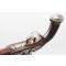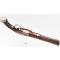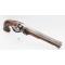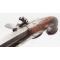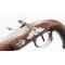 Pistolet à silex pour officier signé P. MEYER à Bruxelles actif entre 1790 et 1800. Platine et chien à col de cygne à corps plat signée de l'arquebusier, mécanisme fonctionnel sans jeu. garniture en fer patinées avec fines taches d'oxydation. Monture en noyer, crosse quadrillée, fêles et légers manque à l'extrémité du fut, fêle à la contre platine et petite enture derrière la queue de culasse. Canon à pans en damas long de 22.2cm, calibre 17.5cm, poinçon ELG, hausse et guidon de visée, traces d'oxydation. Baguette en fer. Longueur totale 37,5cm