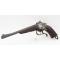 Peu commun pîstolet de tir de fabrication Suisse de la fin du XIXè monocoup calibre 22 LR à bloc tombant à l'aide du levier à anneau sous la crosse ergonomique en noyer. Stecher actionné par la pédale latérale, pontet à repose doigt. Canon octogonal de 27cm signé sur le dessus, hausse réglable et guidon amovible par l'avant, rayures brillantes sans usure particulière ni tache. Finition bronzé et jaspé. Mécanisme fonctionnel. Longueur totale 38cm