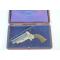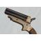 Pistolet poivrière 4 canons Sharp modèle 1859 en coffret original produit à seulement 4000exemplaires, calibre 32 annulaire, capacité 4 coups en simple action. REste d'argenture sur la carcasse et de bronzage bleu sur les canons, patent "C. Sharps & Co Philada. PA" et "C. Sharps Patent 1859" non atténués. Mécanisme complet sans jeu avec un très bon fonctionnement. Canons ronds de 76 mm avec cran de mire en laiton, rayures parfaitement marquées avec légère oxydation. Plaquettes de crosse en gutta-percha finement quadrillées sans accident. Cette pièce très évocatrice de la période de la Conquête de l'Ouest étaient très prisée en son temps comme arme de gousset par les joueurs de carte, elle a l'avantage d,être présentée dans son coffret d'usine à fermeture par bouton poussoir en laiton, intérieur garni de satin violet avec le logo de la marque "C. Sharps & Company Philadelphia P.A." en lettres dorées, coffret en bois est recouvert de cuir marron avec de très légères traces de manipulation et d'usure dues à son âge. Il est extrêmement rare de découvrir ce modèle dans son écrin d'origine il a de ce fait toute sa place dans une collection d'armes américaines du XIXème.