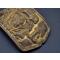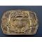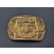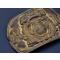 Rare plateau de ceinturon d'un régiment français de cavalerie XVIIIè, armoiries non déterminées sous grosse couronne entouré de trophées d'armes et des initiales R et L, en laiton cuivreux ciselé et finement gravé sur fonds perlés, beau reste de dorure, dimensions 105/65mm
