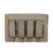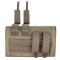 Gros plan d'une poche beige, en plastique rigide, partiellement inséré dans une pochette tactique en tissu assorti. Le chargeur dépasse vers le haut et présente une petite fenêtre sombre permettant de voir les munitions. La pochette est en toile épaisse, avec un cordon élastique sur le côté et un passant en tissu à l'avant. Fond clair et uni.