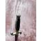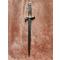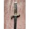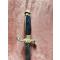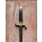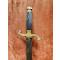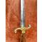 Lame de 22 cm, large au talon de 1,8 cm, a deux tranchants et arrete mediane, gravée de motifs dorés à l'origine Marquage au talon en cursives "P. Kneckt" et de l'autre “Solingen” (manufacture à Solingen début du XIXe siècle, 1820-1830).
