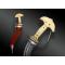 La poignée est réalisé de six plaquettes en os, rivetées sur la soie ; une garde est présente sur côté, elle est repliée à son extrémité.