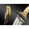 Lame en acier, à double tranchants et double courbure, avec renfort trilobé à la base ; arête médiane et double gouttière.