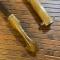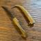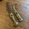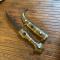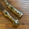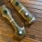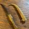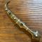 Fourreau bois recouvert de plaque laiton ciselé et poigne en aussi en laiton ciselé , orné de pierre blanche et verte .