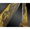 Lame courbe, en damas, à un tranchant en acier et arrête médiane ; dos en T sur la première partie et pointe en perce maille. Décor peint à l’or et damasquine, avec dans un cartouche une calligraphie ; un des côtés porte l’inscription d’un collectionneur « PECH KABZ »