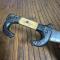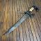 Manche à plaquettes en os , pommeau et croisières en bois noirci recourbés formant une garde fini en tête d'animal de profile zoomorphe . Lame acier.