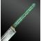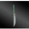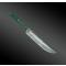 La poignée est constituée de deux plaquettes de jade rivetées à trois reprises de fleurettes, la virole est en argent, la lame en acier est droite à un tranchant, légèrement biseautée sur la partie distale et marquée d’une gorge formant cartouche et de deux croissants de lune sur chaque pan.
