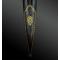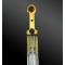 Lame en acier damas à double tranchant et trois gouttières médianes, ornée au talon de six cartouches incrustés à l’or de motifs feuillagés – sur le pan doté de quatre cartouches, le talon est poinçonné à deux reprises.
