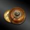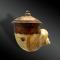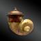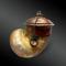 Le contenant de la poire à poudre est constitué d’une coquille de burgau. Sa monture ciselée et son anneau de suspension sont en cuivre. Bouchon doté d’une chaînette en métal argenté.