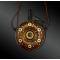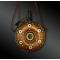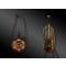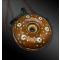 Pulvérin jaugé à clapet à ressort constitué d’anneaux d’os concentriques à décor de clous de fer et filets d’os et marqueterie de d’os et de corne brune, le centre garni d’une bague en os.