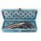Grosse poivrière à broche 12 mm à 6 coups d'une longueur totale de 21,5cm. Présentation version luxe, canons damas bronzés bruns avec le corps gravé de fleurs, de lianes et de feuilles de vigne en fonds noirci. Crosse en ébène de forme gothique.Un bloc canon de 6 tubes lisse soudé autour d'un axe central, sans marquages ou poinçons. Le bloc canon est maintenu par un petit « ergot » sur l'axe central au niveau de la culasse et maintenue par un écrou sur le devant. Détente anneau type Mariette actionnant le chien par le dessous. Culasse tournante avec l'axe du barillet gravé sur le devant :« INV 74 LEFAUCHEUX BREVETE » en triangle. En périphérie et en lettres gothique : « Lefaucheux Inventeur » et son fameux poinçon au pistolet brisé et numéro "LF 384". Coffret velours bleu postérieur.