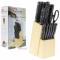 Composition : 1 couteau chef lame 20 cm + 1 couteau pain lame 20.5 cm + 1 santoku lame 17.5 cm + 1 couteau à découper lame 20.5 cm + 1 couteau santoku lame 12.5 cm + 1 couteau utilitaire lame 12.5 cm + 1 couteau office lame courbe 8.5 cm + 6 couteaux steak lame 11.3 cm + 1 fusil + 1 fourchette deux dents + 1 paire de ciseaux.