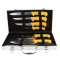 6 Acier Inoxydable 18/0 Manche polypropylène surmoulé jaune Manche ergonomique. Composition: 1 office 9 cm / 1 chef 20 cm / 1 découper 20 cm / 1 désosser 15 cm / 1 désosser souple 18 cm / 1 couperet 18 cm /  1 fusil mèche 25 cm / 1 valise aluminium 40 x 20 x 7 cm