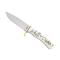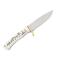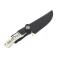 Ce poignard Herbertz 596310 est un couteau de chasse pourvu d'une lame pleine soie robuste et fiable, fabriquée en acier inoxydable 420. Elle mesure environ 10cm de longueur, il y a aussi une garde en laiton afin d'éviter que la main ne vienne glisser lors des utilisations. Si vous ne le savez pas, nous vous informons que la lame peut être personnalisée par procédé gravure en supplément (voir bouton ajouter une gravure). Le manche lui est conçu à partir d'un matériau plastique qui n'est pas sans rappeler l'ivoire. La poignée en ivoirine est décorée par un motif cerf façon scrimshaw, une technique artisanale de gravure autrefois réalisée par les chasseurs. Le joli manche assure aussi une prise en main sûre et confortable, il comporte aussi un trou pour lanière afin d'offrir une meilleure transportabilité. Pour simplifier le transport du poignard, un étui en cuir noir à fermeture pression est présent.
