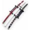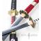 Ensemble des 3 Sabres de Zoro tire du manga One Piece. Katana Wado Ichimonji, Katana Shusui et Katana Kitetstu. Lame tranchante en acier de type Maru avec gorge. Fourreau en bois decore. Peuvent etre utilise pour l'entrainement a la coupe. Longueur de chaque sabre : 103cm Livre avec un support en bois 3 places a poser ou a accrocher sur un mur.