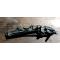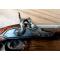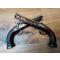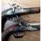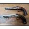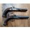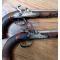 Paire de pistolets à silex d'officier transformés à percussion, canons à pans tromblonés aux bouches à rayures cheveux, poinçonnés au tonnerre sur le dessus "L C" (Leclerc, canonnier de Saint-Etienne) et sur le côté "A M" sous couronne, platines gravées "C de Rey Saint-Etienne", garniture en fer uni découpé, pommeaux octogonaux, crosses en noyer en partie quadrillées sculptées autour des queux de culasse,, baguettes en bois, époque Ier Empire transformés vers 1830 - L. 30 cm