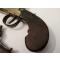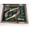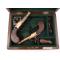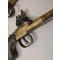 In a Tropical wood case, central scutcheon in brass, not used, with key ( This is not is original case). Interior lined with green felt compartmentalized, containing: Vintage powder flask and screwdriver with rosewood handle. Signs of use appropriate to the age and facelifts. No Ram rods.