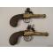 Pair of French Navy Flintlock pistols circa 1790 , in case. Brass barrels half eight fold ending in cannon shape , no proof marks ; body box lock type. Plain walnut stocks ( Same restorations in the stock of both ) ( please see photos) . strong springs , working fine both security and armed positions, but one pistol need help trigger pressure to arm.Seems one top jam screw was substituted in is life time.