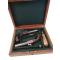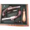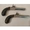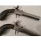 Paire de pistolets à percussion français Boxlock vers 1850, en étui. Canons en acier á pans; corps en acier , gâchettes pliantes, gravure végétaliste sur tout le corps, crosse en noyer peint en noir. Scutcheon ARGENT sur le dos .. Fonctionne très bien dans deux positions. Ressorts très solides, Cheminés ok. Dans un étui en chêne, écusson central en laiton, non utilisé, avec clé (ce n'est pas l'étui d'origine). Intérieur doublé de feutre vert compartimenté, contenant: Poire á poudre apocryphe (vintage) en laiton "type Sykes", tournevis avec manche en palissandre. Signes d'utilisation adaptés à l'âge .