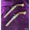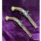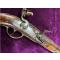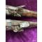 Paire de pistolets à silex à montures en noyer clair, canons ronds puis octogonaux au tonnerre signé sur le dessus "MAFFEO FRANCINO IN BORGO", platines à corps ronds signées I. HALIN, chiens à col de cygne. garnitures en laiton sculptées de têtes grotesques, de rinceaux et de feuillages calottes à queues longues figurant une tête grotesque, baguettes en bois