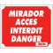 Panneau ''Mirador accès interdit danger'' 30 x 25 cm akyluxLe panneau ''Mirador accès interdit danger'' de dimensions 30 x 25 cm en akylux est un outil essentiel pour assurer la sécurité sur les sites sensibles et restreindre l'accès aux zones à risque. Fabriqué en matériau akylux de haute qualité, ce panneau est résistant aux intempéries et durable. Vendu à l'unité