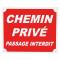 Panneau « chemin privé passage interdit » 25 x 30 cm en aluminium : sécurisez efficacement votre propriété privée grâce à ce panneau signalétique professionnel et résistant. Idéal pour protéger laccès à un chemin privé, ce panneau en aluminium de haute qualité assure visibilité et dissuasion auprès des intrus ou visiteurs non autorisés. Optez pour la tranquillité et la conformité avec une signalisation claire, durable et parfaitement adaptée à un usage extérieur. Caractéristiques principales ... Contactez-nous pour plus d'infos ?