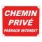 Panneau chemin privé passage interdit dim 25 x 30 cm akylux : Sécurisez efficacement l'accès à votre propriété avec ce panneau chemin privé « Passage interdit » au format 25 x 30 cm en Akylux. Idéal pour signaler une voie privée et dissuader les intrusions, ce panneau robuste et léger assure une visibilité optimale et une installation rapide sur tout type de support. Parfait pour les collectivités, les entreprises et les particuliers exigeants en signalétique extérieure.