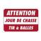 Avec sa mention Attention Jour de Chasse Tir à Balles il dissuadera d'éventuels promeneurs de s'approcher de vos traques en cours et évitera d'éventuels accidents.