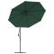 Parasol avec éclairage LED 300 cm Poteau en métal VertCet élégant parasol de jardin suspendu avec éclairage LED est un choix parfait pour créer de l'ombre et vous protéger des rayons UV nocifs du soleil. Lorsque le soleil se couche, les LED atmosphériques à énergie solaire éclairent automatiquement votre espace de vie extérieur. La grande toile mesure 300 cm de diamètre et elle est fabriquée en polyester résistant aux UV et à la décoloration. Le solide poteau métallique, les nervures (8) et la base croisée rendent le parasol très stable et durable. L'auvent pend librement du poteau, de sorte que l'espace sous le parapluie reste sans obstruction. Le parasol de jardin peut être facilement ouvert et fermé grâce au mécanisme à manivelle. Les 24 LED intégrées, alimentées par 1 panneau solaire, créeront une ambiance agréable et romantique la nuit. L'assemblage est facile. Il est important que tout produit assemblé à l'aide d'une vis, quelle qu'elle soit, soit resserré deux semaines après l'assemblage et une fois tous les trois mois, afin d'assurer la stabilité du produit pendant toute sa durée de vie. Ne serrez pas complètement chaque vis avant que toutes les vis soient correctement fixées. Tenir les enfants à l'écart de la zone d'assemblage pendant le montage. Manipulez les pièces lourdes avec précaution. Assurez-vous que ce produit est entièrement assemblé comme illustré avant de l'utiliser. Ce produit ne doit être utilisé que sur un sol ferme et plat. Veillez à ce que le produit soit toujours placé sur un sol plat. Aucune responsabilité ne sera acceptée en cas de dommages ou de blessures causés par une utilisation incorrecte de ce produit. Tenir les mains à l'écart du mécanisme de pliage et des pièces mobiles afin d'éviter tout risque de blessure. N'utilisez ni n'ouvrez jamais ce parasol sans qu'une base appropriée ne soit en place. N'utilisez pas ce parasol pendant les périodes de vent fort et de pluie. Le non-respect de cette consigne peut entraîner des blessures et/ou des dommages. Fermez toujours le parasol et mettez la housse si le vent dépasse une « brise modérée », s'il y a des chutes de neige ou s'il pleut. Le produit contient de petites pièces qui peuvent présenter un risque pour les jeunes enfants. Gardez les petites pièces hors de portée des enfants. Ce produit n'est pas un jouet ! Veillez à ce que les enfants n'utilisent pas le parasol, l'auvent ou la base pour jouer ou grimper. pour jouer ou grimper. N'utilisez pas de feu ouvert (par exemple, barbecue ou grill) sous ou à côté de ce produit. Si la vitesse du vent dépasse 6 m/s ou en cas de fortes pluies, retirez soigneusement le produit, pliez-le, sécurisez-le et mettez-le dans un endroit sûr. Si le tissu devient accidentellement mouillé, séchez-le immédiatement pour éviter un vieillissement prématuré du produit. Vérifiez avant utilisation que votre gazebo, tente, parasol ou pavillon n'est pas endommagé (éléments métalliques pliés, tissu déchiré). En cas de dommages, n'utilisez pas le produit. Le non-respect de ces consignes peut entraîner des dommages.