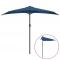 Parasol de balcon avec mât en aluminium Bleu 270x144x222cm DemiCet élégant parasol de balcon est parfait pour créer de l'ombre et vous protéger des rayons UV nocifs. Fabriquée en polyester anti-UV et anti-décoloration, la couverture de parasol vous offre une protection optimale contre le soleil et est facile à nettoyer. Avec un diamètre de mât de 38 mm, il pourrait être monté sur le support ou au milieu de tables avec trou. Sa forme demi-ronde ajoute également au charme unique du parasol. Le mât en aluminium résistant, ainsi que les 5 nervures en acier robustes, rendent le parasol très stable et durable. Le parasol de jardin peut être facilement ouvert et fermé grâce au mécanisme à manivelle. Veuillez noter que le socle de parasol n'est pas inclus dans la livraison. Nous vous recommandons de traiter le tissu du parasol avec un spray imperméabilisant s'il est soumis à des fortes précipitations. Ce produit ne convient pas aux intempéries telles que le vent fort, les chutes de neige et les conditions météorologiques extrêmes.