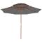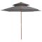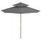 Parasol à deux étages avec mât en bois 270 cm anthraciteCet élégant parasol en bois est parfait pour créer de l'ombre et vous protéger des rayons UV nocifs. Fabriquée en polyester anti-UV et anti-décoloration, la couverture de parasol vous offre une protection optimale contre le soleil et est facile à nettoyer. Avec un diamètre de mât de 38 mm, il pourrait être monté sur le support existant ou au milieu de tables percées. Le mât en bois fort, associé aux 8 nervures durables, rend le parasol très stable et durable. La construction à double auvent permet la circulation de l'air un jour chaud. Le parasol de jardin peut être facilement ouvert et fermé grâce au système à une poulie. L'article est facile à assembler. Veuillez noter que nous vous recommandons de traiter le tissu du parasol avec un spray imperméabilisant s'il est soumis à des fortes précipitations.