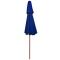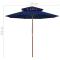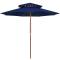 Parasol à deux étages avec mât en bois bleu 270 cmCet élégant parasol de jardin en bois est parfait pour créer de l'ombre et vous protéger des rayons UV nocifs. Fabriquée en polyester anti-UV et anti-décoloration, la couverture de parasol vous offre une protection optimale contre le soleil et est facile à nettoyer. Avec un diamètre de mât de 38 mm, il pourrait être monté sur le support existant ou au milieu de tables percées. Le mât en bois fort, associé aux 8 nervures durables, rend le parasol d'extérieur très stable et durable. La construction à double auvent permet la circulation de l'air par un jour chaud. Le parasol de jardin peut être facilement ouvert et fermé grâce au système à une poulie. Veuillez noter que nous vous recommandons de traiter le tissu du parasol avec un spray imperméabilisant s'il est soumis à des fortes précipitations.