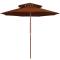 Parasol à deux étages avec mât en bois terre cuite 270 cmCet élégant parasol de jardin en bois est parfait pour créer de l'ombre et vous protéger des rayons UV nocifs. Fabriquée en polyester anti-UV et anti-décoloration, la couverture de parasol vous offre une protection optimale contre le soleil et est facile à nettoyer. Avec un diamètre de mât de 38 mm, il pourrait être monté sur le support existant ou au milieu de tables percées. Le mât en bois fort, associé aux 8 nervures durables, rend le parasol d'extérieur très stable et durable. La construction à double auvent permet la circulation de l'air par un jour chaud. Le parasol de jardin peut être facilement ouvert et fermé grâce au système à une poulie. Veuillez noter que nous vous recommandons de traiter le tissu du parasol avec un spray imperméabilisant s'il est soumis à des fortes précipitations.