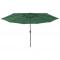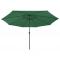 Parasol de jardin avec lumières LED et mât en métal 400 cm vertCe parasol de jardin tendance avec des lumières LED est une excellente solution pour créer de l'ombre et vous protéger des rayons UV nocifs. Ce parasol est fabriqué en polyester qui vous offre une protection optimale contre les coups de soleil. Le mât en métal fort, ainsi que les baleines rigides, maintiennent le parasol stable et robuste. Il dispose de 32 LED pour éclairer et créer une ambiance chaleureuse et romantique la nuit. En outre, il peut également être ouvert et fermé facilement grâce au mécanisme à manivelle. Tenir les enfants à l'écart de la zone d'assemblage pendant le montage. Manipulez les pièces lourdes avec précaution. Assurez-vous que ce produit est entièrement assemblé comme illustré avant de l'utiliser. Ce produit ne doit être utilisé que sur un sol ferme et plat. Veillez à ce que le produit soit toujours placé sur un sol plat. Aucune responsabilité ne sera acceptée en cas de dommages ou de blessures causés par une utilisation incorrecte de ce produit. Tenir les mains à l'écart du mécanisme de pliage et des pièces mobiles afin d'éviter tout risque de blessure. N'utilisez ni n'ouvrez jamais ce parasol sans qu'une base appropriée ne soit en place. N'utilisez pas ce parasol pendant les périodes de vent fort et de pluie. Le non-respect de cette consigne peut entraîner des blessures et/ou des dommages. Fermez toujours le parasol et mettez la housse si le vent dépasse une « brise modérée », s'il y a des chutes de neige ou s'il pleut. Le produit contient de petites pièces qui peuvent présenter un risque pour les jeunes enfants. Gardez les petites pièces hors de portée des enfants. Ce produit n'est pas un jouet ! Veillez à ce que les enfants n'utilisent pas le parasol, l'auvent ou la base pour jouer, grimper, jouer ou grimper. N'utilisez pas de feu ouvert (par exemple, barbecue ou grill) sous ou à côté de ce produit.