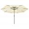 Parasol de jardin avec lumières LED et mât en métal 400cm sableCe parasol de jardin tendance avec des lumières LED est une excellente solution pour créer de l'ombre et vous protéger des rayons UV nocifs. Ce parasol est fabriqué en polyester qui vous offre une protection optimale contre les coups de soleil. Le mât en métal fort, ainsi que les baleines rigides, maintiennent le parasol stable et robuste. Il dispose de 32 LED pour éclairer et créer une ambiance chaleureuse et romantique la nuit. En outre, il peut également être ouvert et fermé facilement grâce au mécanisme à manivelle. Tenir les enfants à l'écart de la zone d'assemblage pendant le montage. Manipulez les pièces lourdes avec précaution. Assurez-vous que ce produit est entièrement assemblé comme illustré avant de l'utiliser. Ce produit ne doit être utilisé que sur un sol ferme et plat. Veillez à ce que le produit soit toujours placé sur un sol plat. Aucune responsabilité ne sera acceptée en cas de dommages ou de blessures causés par une utilisation incorrecte de ce produit. Tenir les mains à l'écart du mécanisme de pliage et des pièces mobiles afin d'éviter tout risque de blessure. N'utilisez ni n'ouvrez jamais ce parasol sans qu'une base appropriée ne soit en place. N'utilisez pas ce parasol pendant les périodes de vent fort et de pluie. Le non-respect de cette consigne peut entraîner des blessures et/ou des dommages. Fermez toujours le parasol et mettez la housse si le vent dépasse une « brise modérée », s'il y a des chutes de neige ou s'il pleut. Le produit contient de petites pièces qui peuvent présenter un risque pour les jeunes enfants. Gardez les petites pièces hors de portée des enfants. Ce produit n'est pas un jouet ! Veillez à ce que les enfants n'utilisent pas le parasol, l'auvent ou la base pour jouer, grimper, jouer ou grimper. N'utilisez pas de feu ouvert (par exemple, barbecue ou grill) sous ou à côté de ce produit.